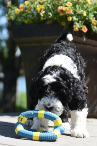 We work closely with families to ensure that each puppy is placed in the most appropriate home. We have impartial breeders come and conduct structure and the APET temperament tests at 7 weeks old. This gives us a lot of information about each puppy, and helps us decide which home is best for them. Our pupppies are all friendly and happy but some will be better suited to an athletic home (think “jock”), some will be better suited to conformation, and some will be better suited to a retired couple than a family with little kids. We want to place a puppy who is a “jock” with an athletic family, and a “beauty queen” with a like-minded famly. We value learning a lot about your family so that we can match the best puppy for you. All aspects of the new home are considered for puppy placement, including other pets, children, yard size, special needs, and the amount of time the new owners are able to spend with the puppy. Another primary consideration is the type(s) of activities and dog sports that the new owners are planning on doing with the puppy. Keep in mind that Portuguese Water Dogs are very active dogs and enjoy being with their families. We’re always proud when families tell us we’ve chosen just the right puppy for them.